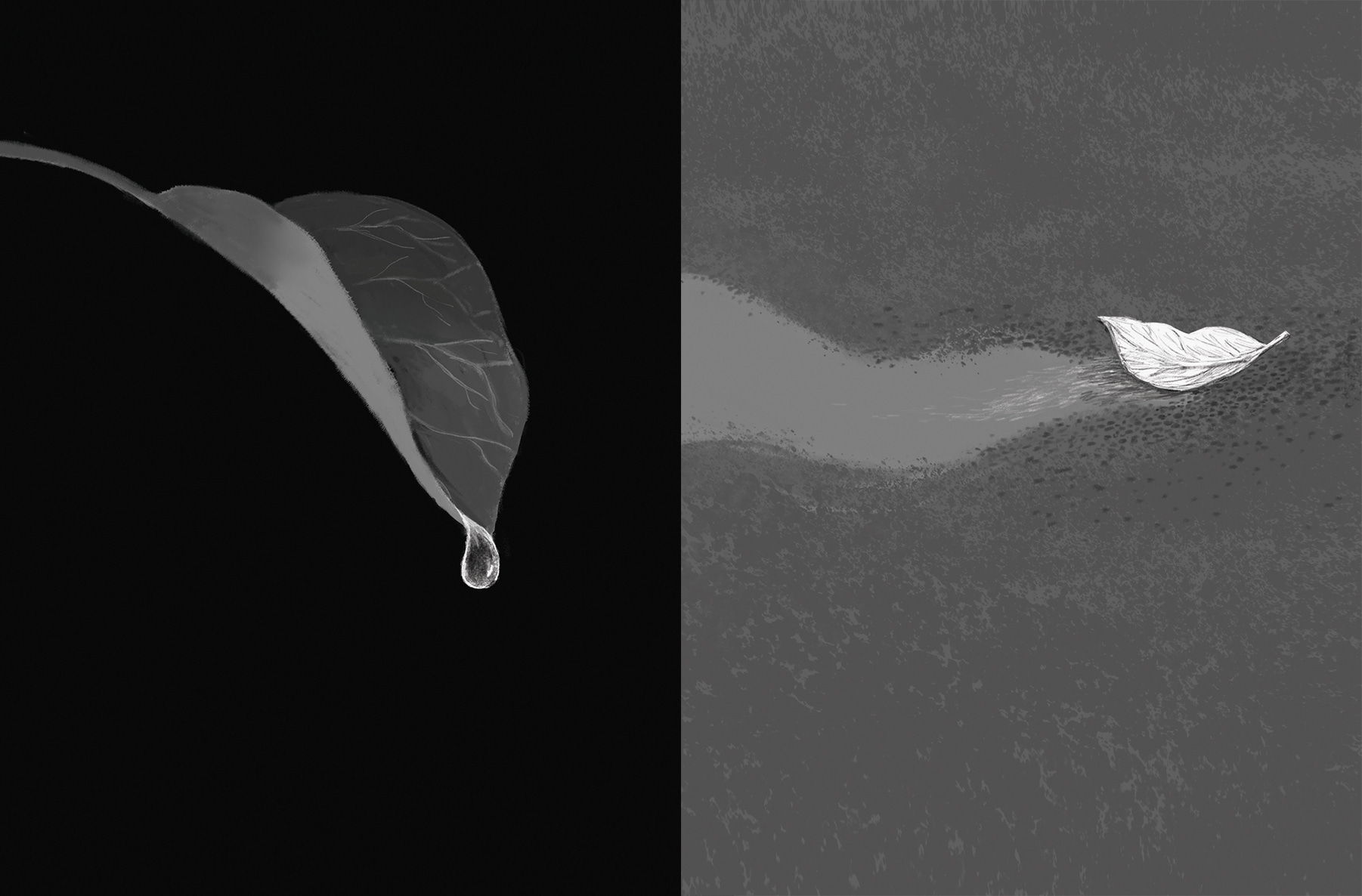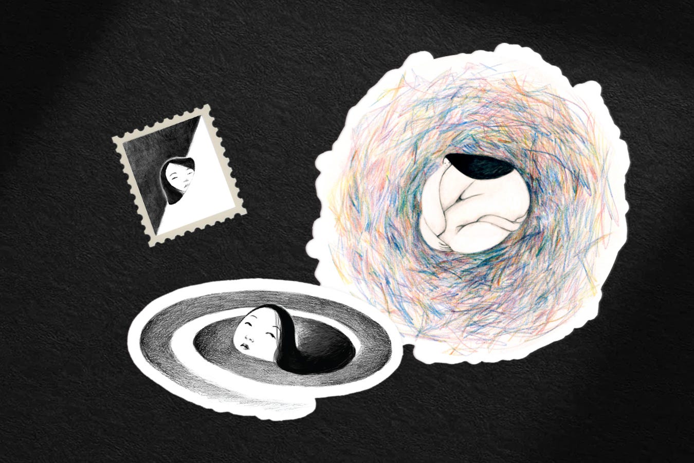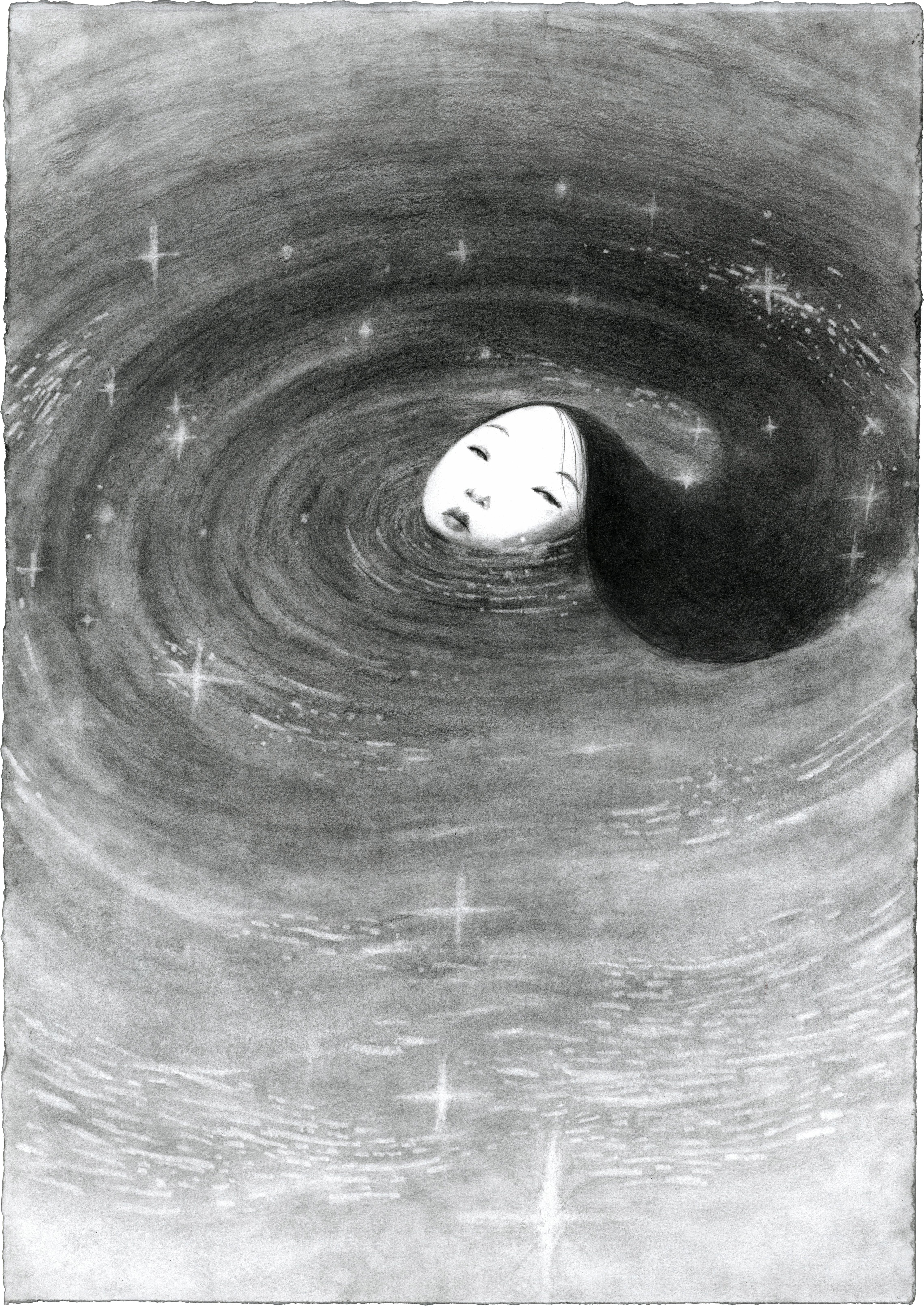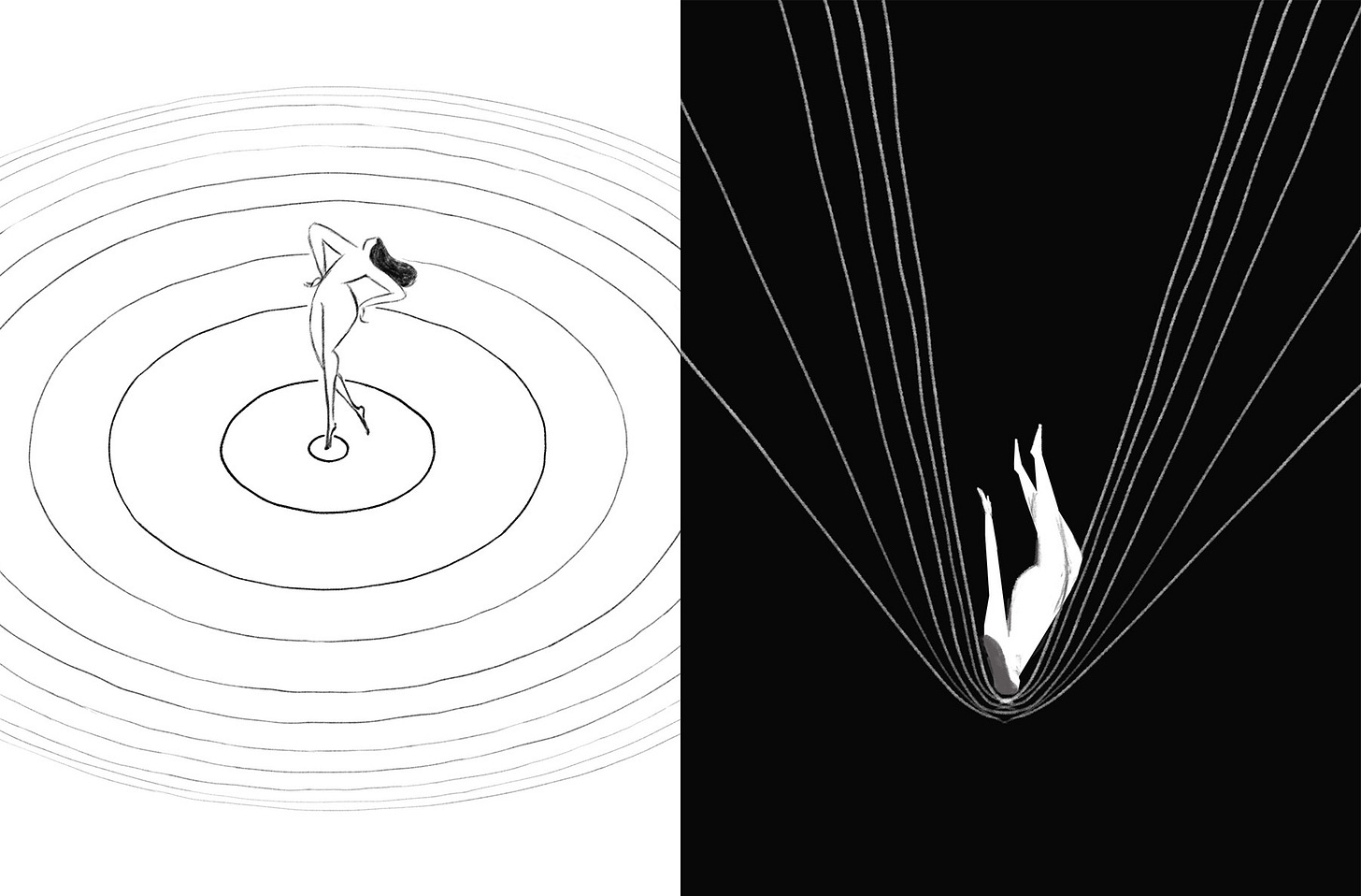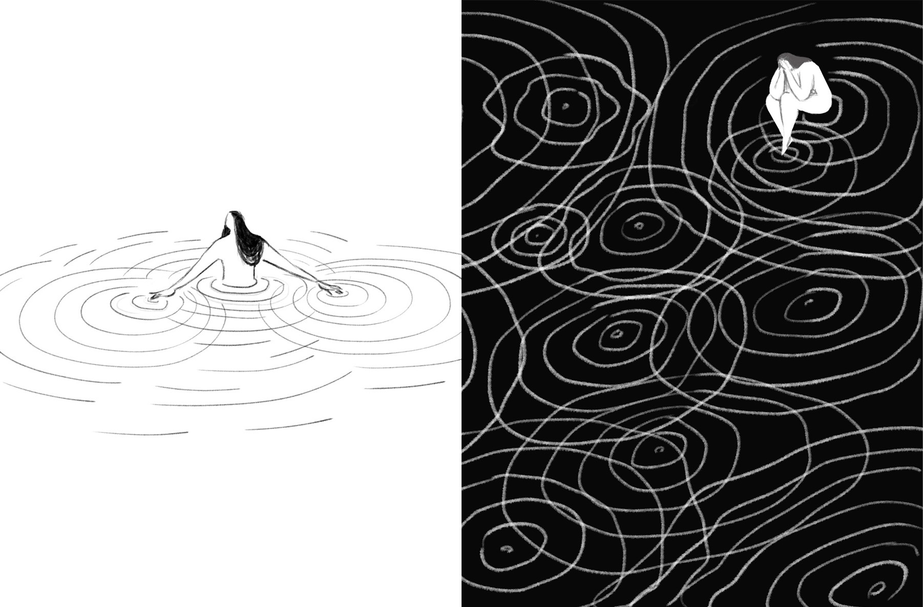 Flotsam - A woman floats suspended in murky waters that dissolve into the void of space—half alive, half letting go. A place where answers blur and dissolve, where existence is never black or white but something in between.